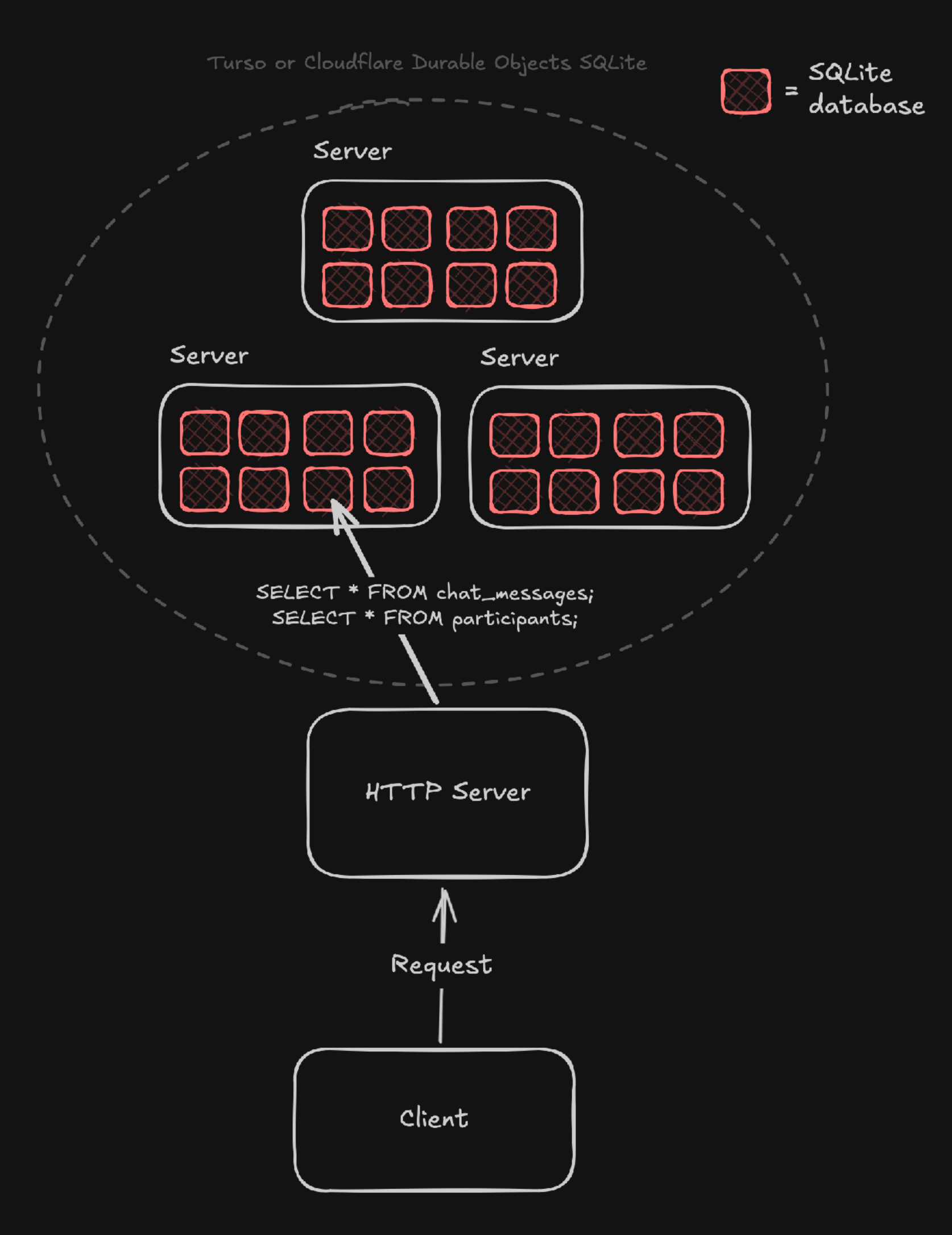 From Cloudflare Durable Objects or Turso, this SQLite partition database could be queried like this: